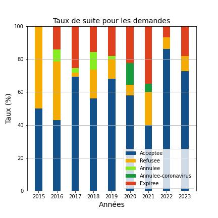 (violet : 0, expirée ; jaune : 1, acceptée), il s'agit des données issues de l'observation. Les deux zones colorées représentent les résultats du modèle (0 ou 1) quand il est appliqué aux variables et la frontière serait
