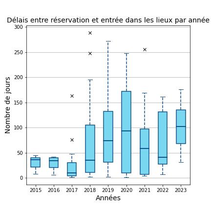 les séjours d'une nuit, puis les séjours de trois et quatre nuits. En revanche, la figure B montre que le délai médian pour les séjours