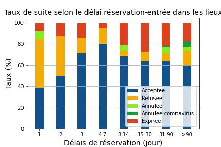 Les réservations de dernière minute ne rapportent pas plus que les autres (4,6% du revenu total potentiel), mais pire, elles incitent fortement l'hôte à refuser la demande. Refuser une demande est une action possible pour l'hôte mais elle entraine à moyen-terme une moins bonne visibilité de l'annonce. La Figure C montre que les demandes de réservation réalisées une ou deux nuits avant la date d'entrée dans les lieux ont un taux de refus bien supérieur aux autres demandes. La figure D montre que les revenus potentiels des réservations de dernière minute (un ou deux jours avant) sont négligeables par rapport au revenu potentiel total.