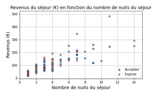 représentent respectivement le nombre de nuits du séjour et les revenus du séjour. Les points croisent ces deux variables et la couleur symbolise l'issue de la demande