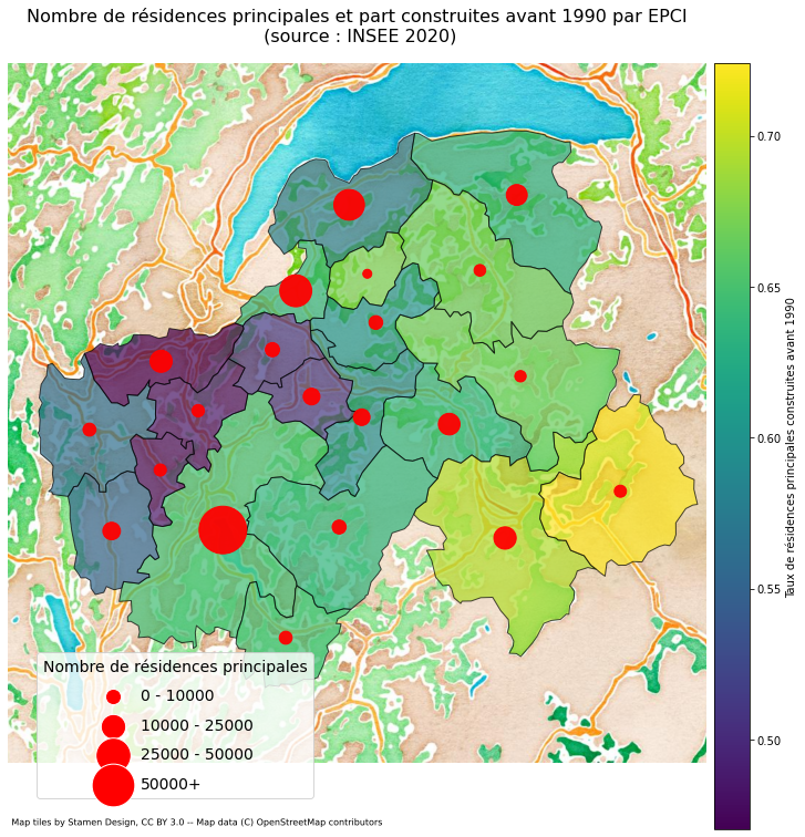 Au niveau de l'âge du parc de logements, la date de 1990 a été choisie comme pivot entre l'ancien et le récent (existence de la réglementation thermique en 1988).