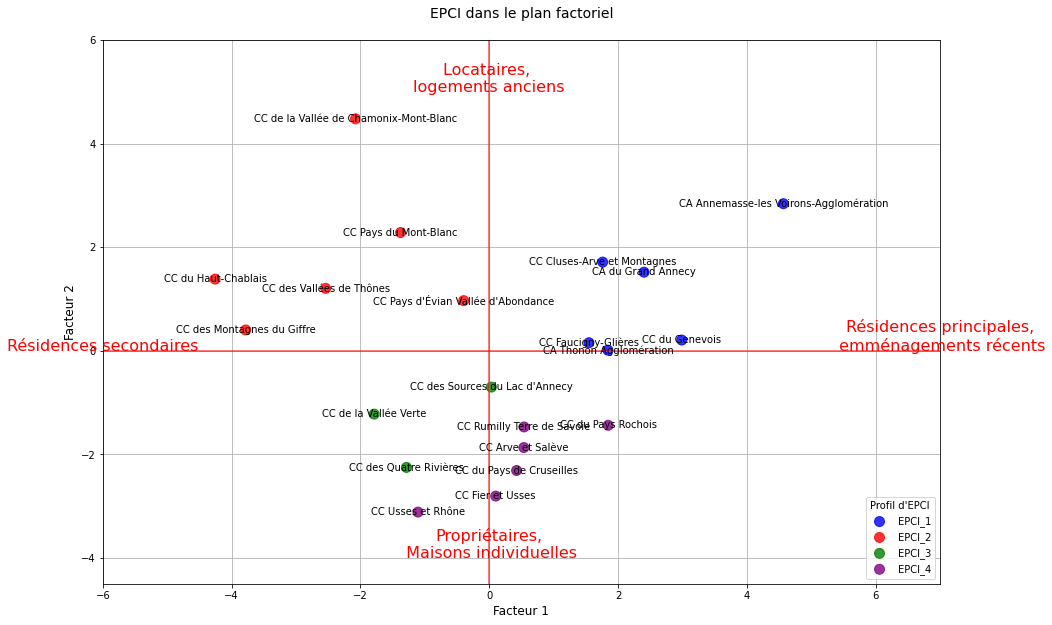 Les EPCI se répartissent dans un plan factoriel à deux facteurs :
